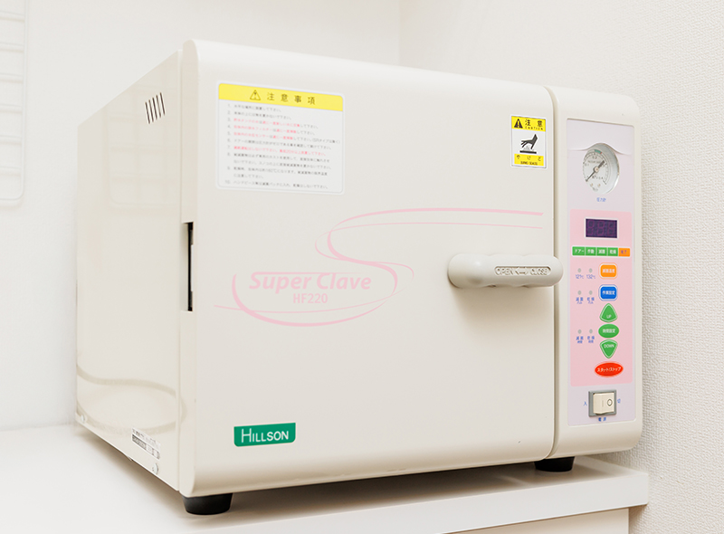 衛生面が心配で歯医者嫌いになる方もいらっしゃいます。そのような不安を払拭できるよう、設備面でも人材面でも感染対策を徹底しています。その一環として、最新の滅菌器「クラスBオートクレーブ」を導入しました。ハンドピースや治療器具を高温高圧で滅菌し、確実に殺菌可能です。また、患者様ごとにグローブやエプロンを交換し、スタッフの手指消毒も欠かしません。